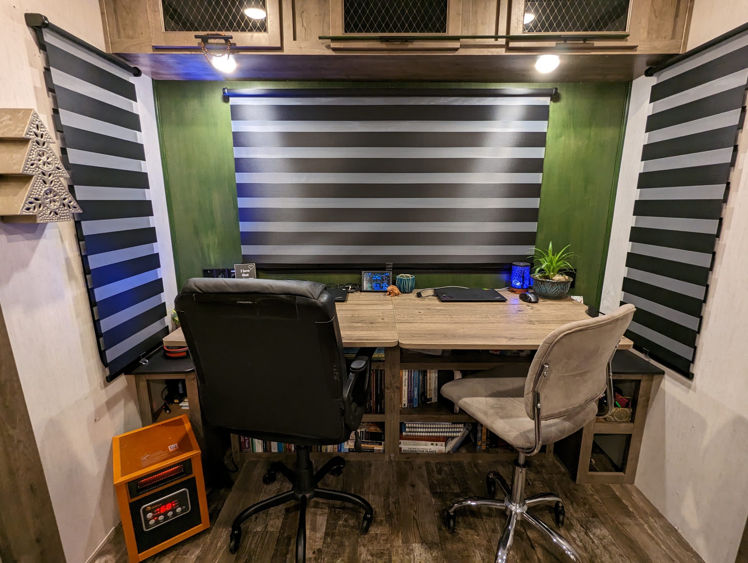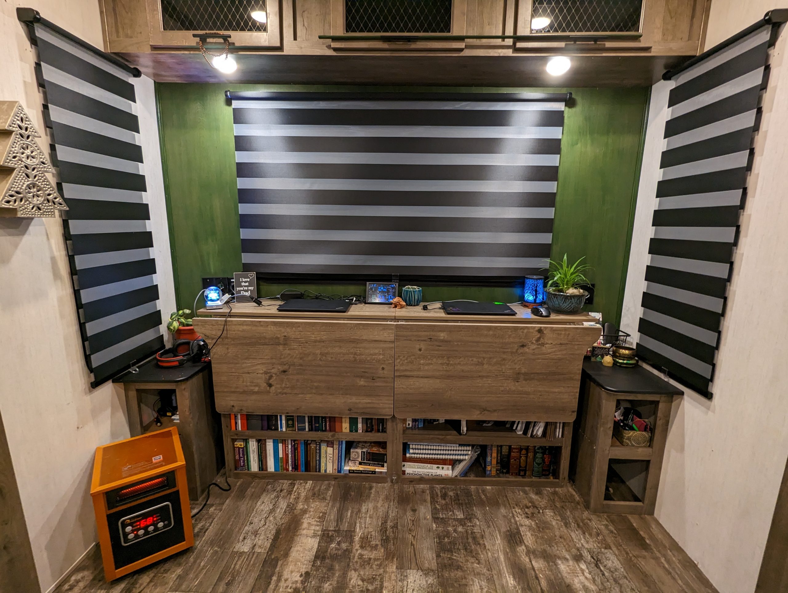 We began by removing our shelf/desk unit and the factory installed side tables. These side tables were installed next to the jack-knife couch that we removed to install our workstations. We kept the side tables and cabinets because they were there and they offered storage space. They weren’t holding up well at all though. The cabinet on the service side had recently broken under the load of the items stored in the cabinet. Thankfully the shore power cord hidden inside the cabinet was not damaged.
